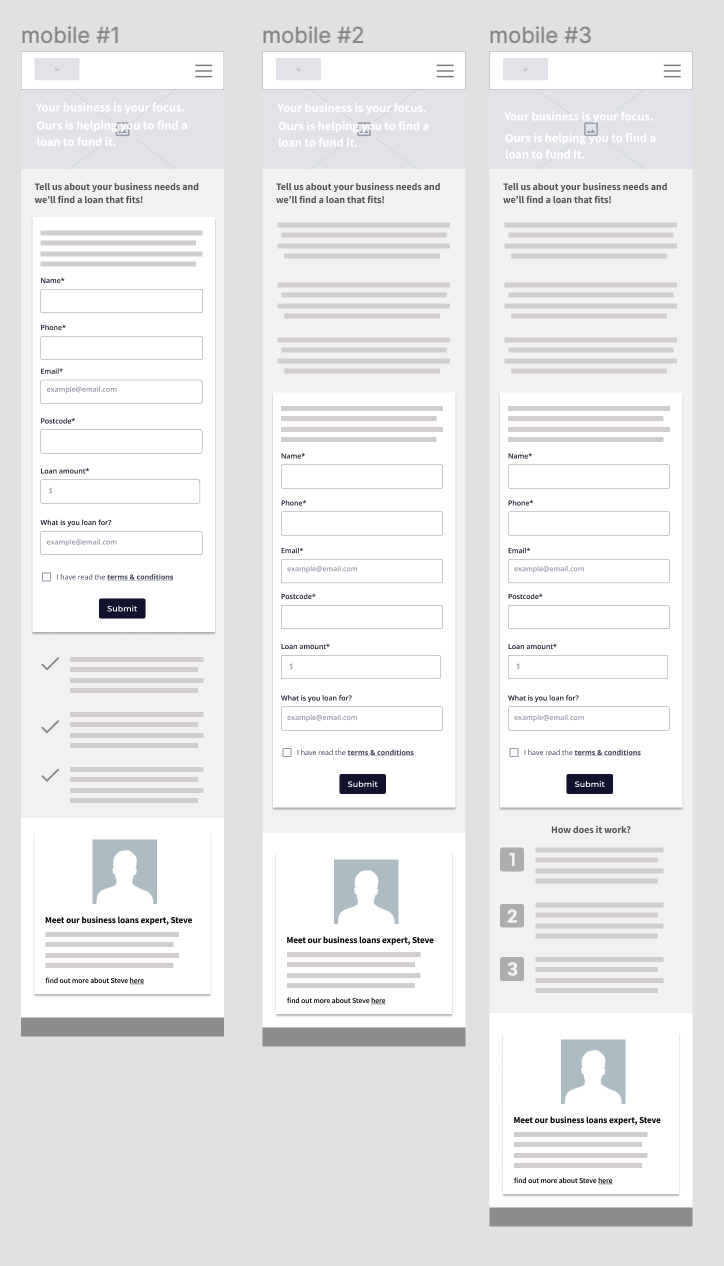 Stakeholders asked for image used in header of business loans landing page to be incorporated for consistency. First draft had selling points of mozo’s loan service placed beneath form as also suggested by stakeholders